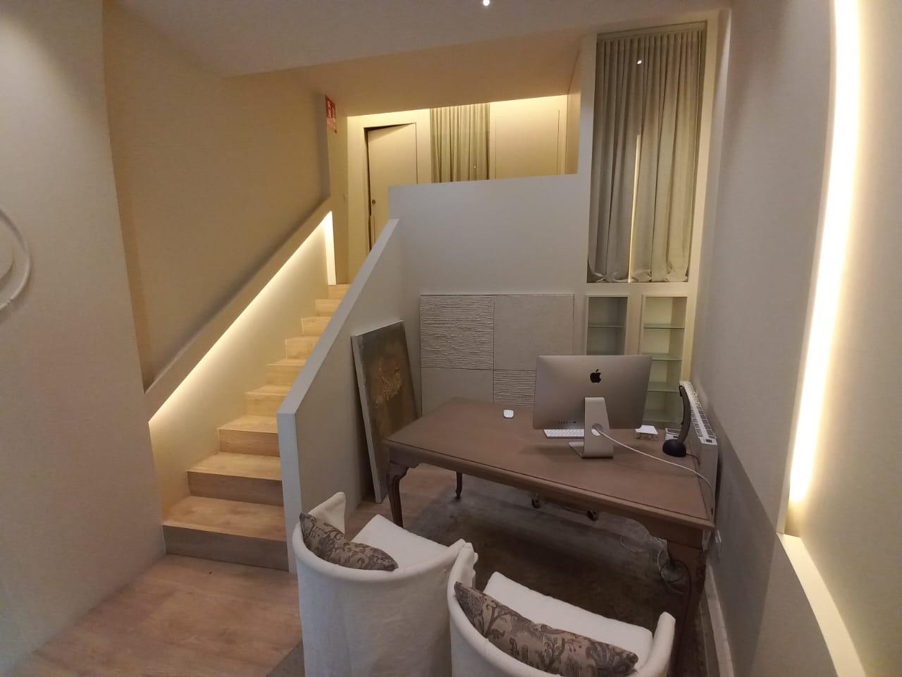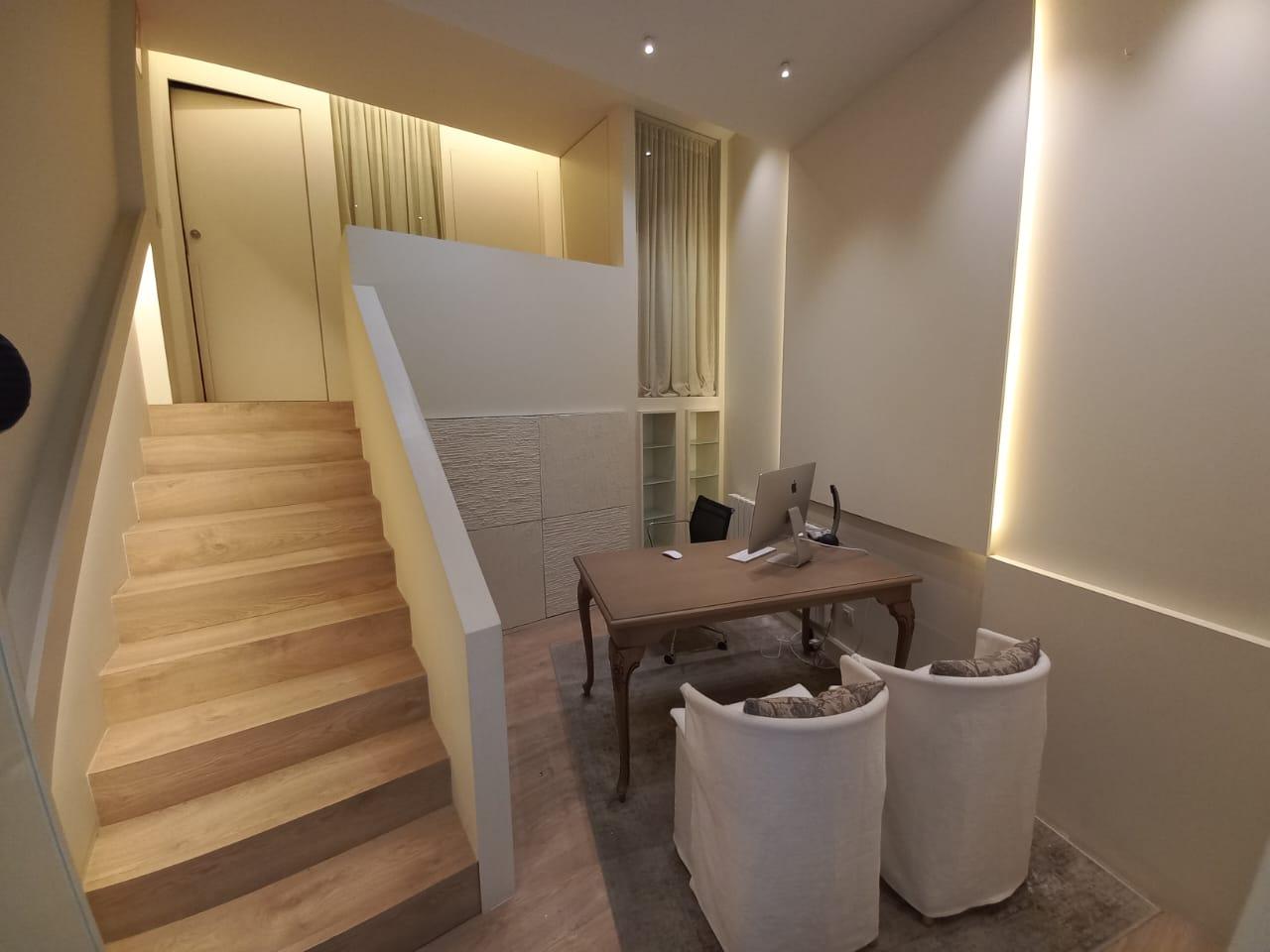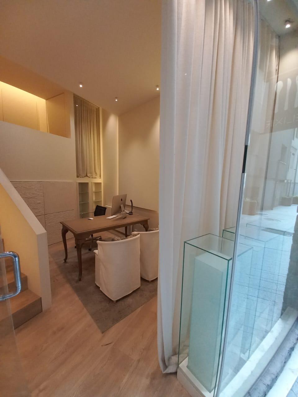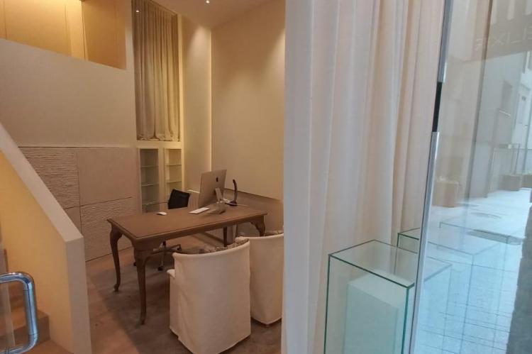 Te uns 38 m2 i actualment te un espai de recepció, dos zones de despatx o cabina i un bany.