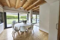 El primer pis té un saló gran, confortable, amb llar de foc i grans finestrals, oberts al jardí. Els sostres tenen bigues de fusta que creen un ambient molt acollidor. També hi ha una zona de menjador semi-oberta, amb una magnífica vista panoràmica del jardí. La cuina comunica amb el saló-menjador mitjançant portes corredisses i té sortida al jardí. Inclou una pràctic rebost. En aquest mateix nivell, hi ha un lavabo de cortesia i una habitació ideal per als convidats o per acomodar-la com a despatx.